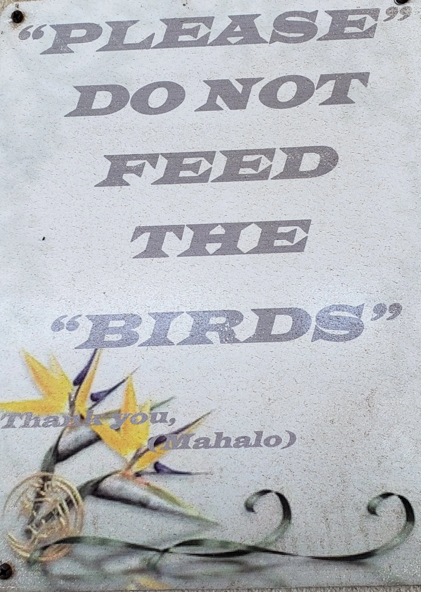 At this point in the day my husband and I are pretty hungry as we'd skipped breakfast so we stopped at a little outdoor cafeteria thing to grab a quick bit. Full disclosure, I'm pretty sure I only got a water because they sold hot dogs and something else I don't eat. Anyway, I'm only bringing this up because they had numerous signs up like this one. This sign blows my mind. What is happening with the quotes? Do they not really mean "please"? Are they not actually talking about the "birds"? What does this mean????